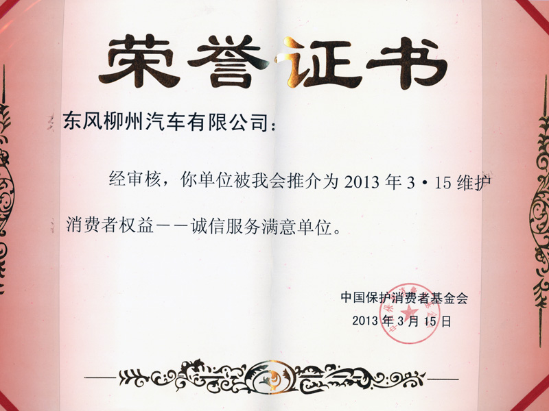 获奖名称:2013年3.15维护消费者权益--诚信服务满意单位