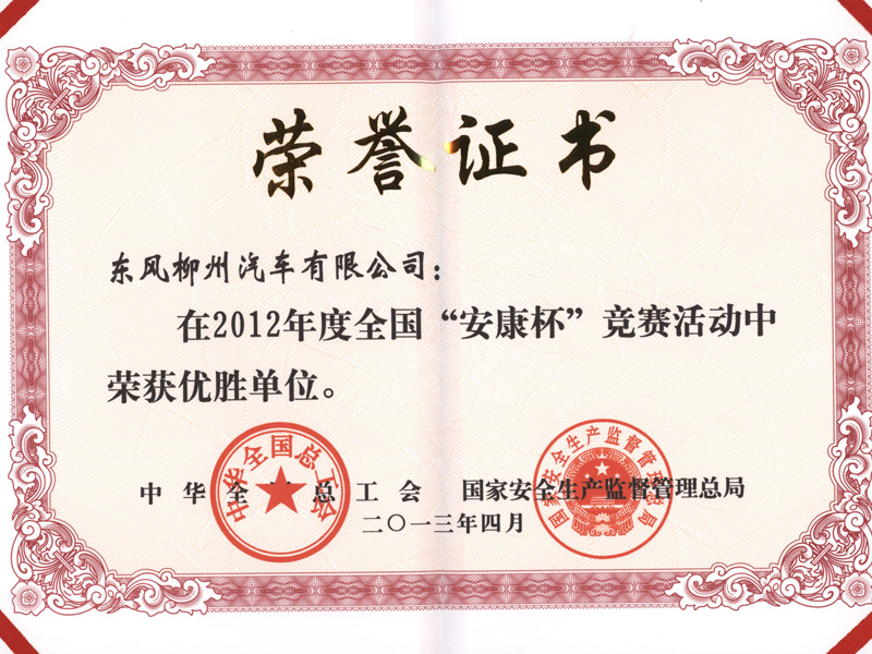 获奖名称:2012年度全国"安康杯"竞赛活动优胜单位